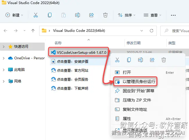 2.打开解压后的文件夹,鼠标右击【VSCodeUserSetup-x64-1.67.0】选择【以管理员身份运行】。