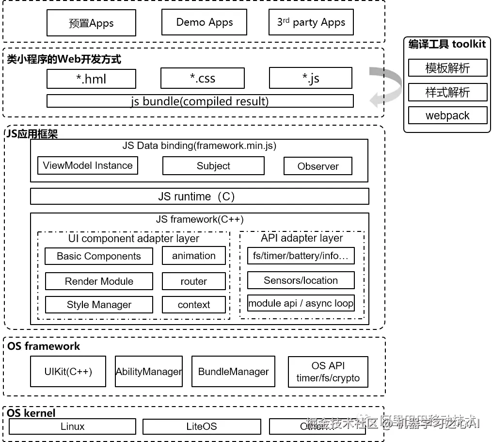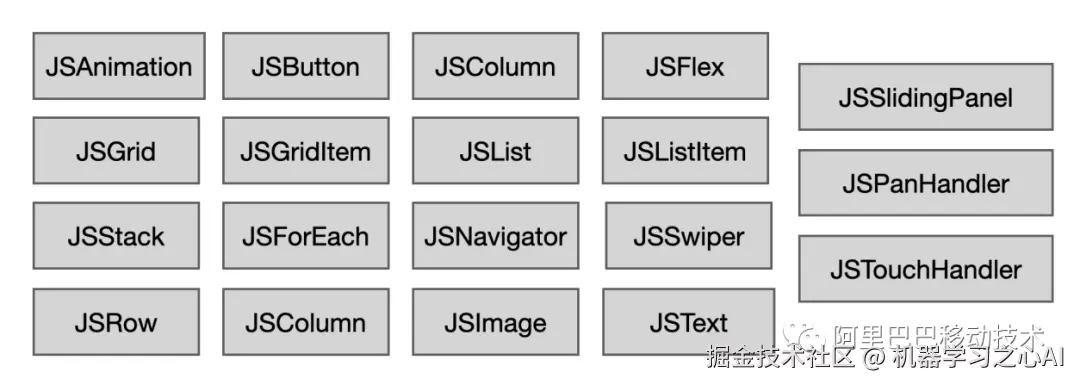 看起来和主流 JS + 原生渲染框架的架构都相似,提供了编译工具将源码编译成 js bundle,运行时有个在 JS 引擎启动后默认执行的 framework.min.js 文件,实现节点构建逻辑,然后在 C++ 层实现了一套 UIKit,支持的组件大概有二三十个。
