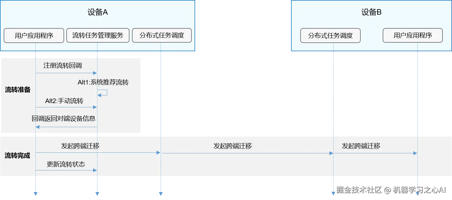 以设备A的应用和设备B的应用进行跨端迁移为例,业务流程如下: