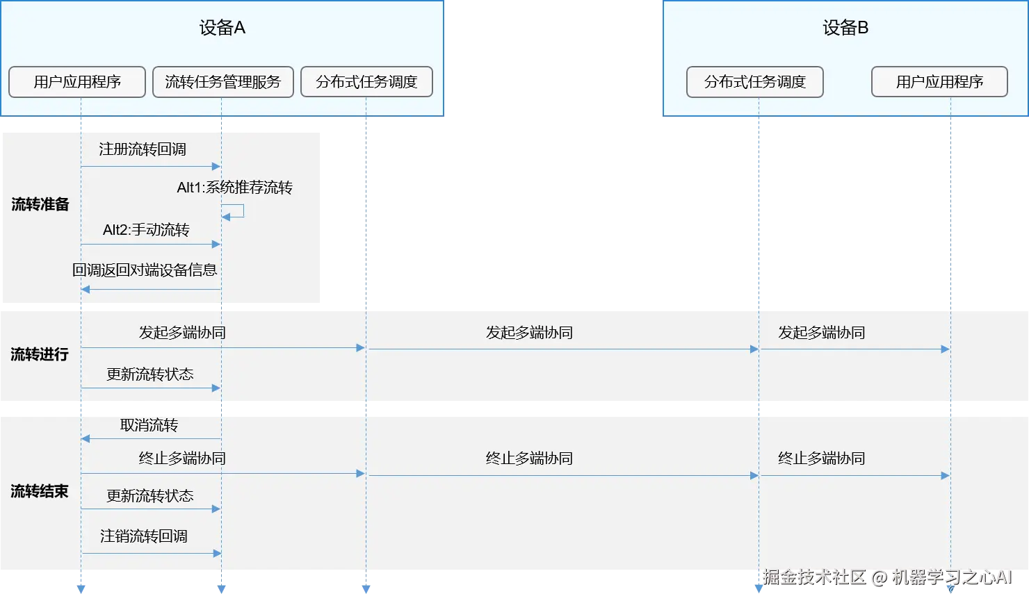 - 流转进行:设备A上的应用通过调用分布式任务调度的能力,如startAbility, connectAbility等,向设备B的应用发起多端协同。流转中将流转状态上报到流转任务管理服务。