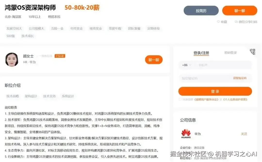 京东发布了前端架构师(鸿蒙方向)岗位,薪资待遇为40-70k, 要求5—10年工作经验,有鸿蒙操作系统相关开发经验,鸿蒙应用开发经验者优先;