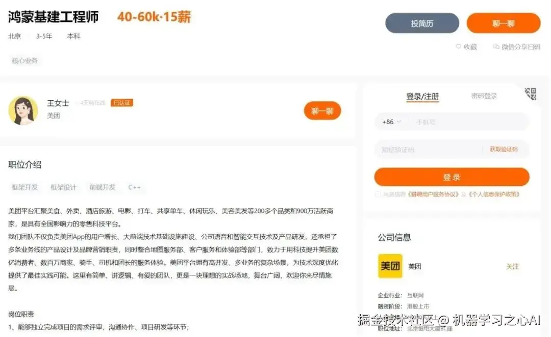 记者在猎聘上看到,美团发布了鸿蒙基建工程师的岗位,薪资待遇为40-60k·15薪,要求3-5年工作经验,具备鸿蒙经验者优先;