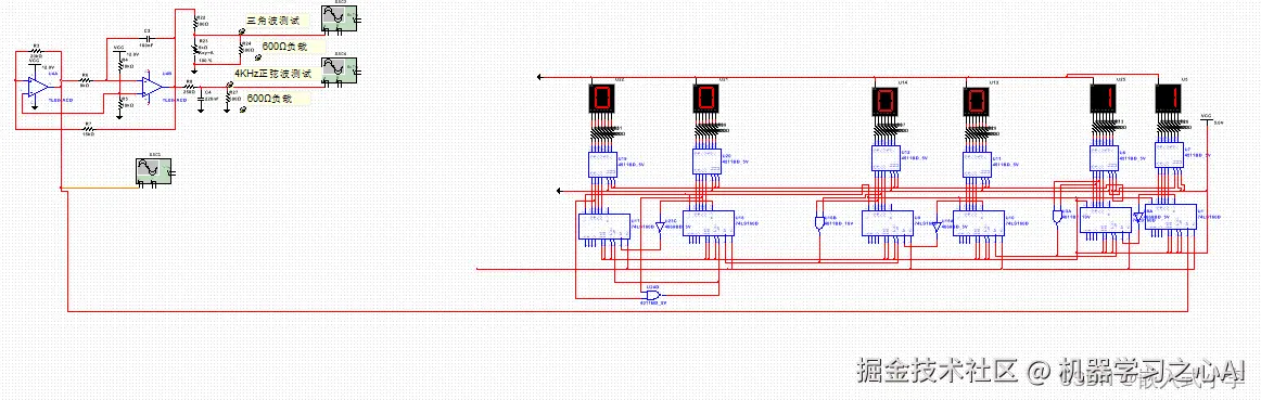 左边的运放构成了振荡电路,可以产生脉冲波。这个脉冲波给计时电路提供基准振荡时钟。右边的计时电路,采用 74LS160芯片,通过级联、以及合理使用一些逻辑门电路,依次构成60进制、60进制、24进制的计时器。显示电路,就直接采用数码管以及数码管的译码芯片CD4511.