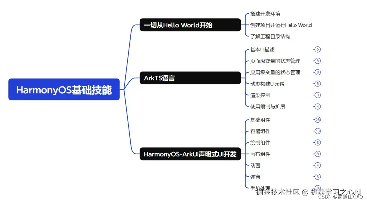 首先得是开发语言 ArkTS,这个尤为重要,然后就是ArkUI声明式UI开发、Stage模型、网络/数据库管理、分布式应用开发、进程间通信与线程间通信技术、OpenHarmony多媒体技术……等。像中间还有许多的知识点,这边都以梳理成思维导图的形式了。