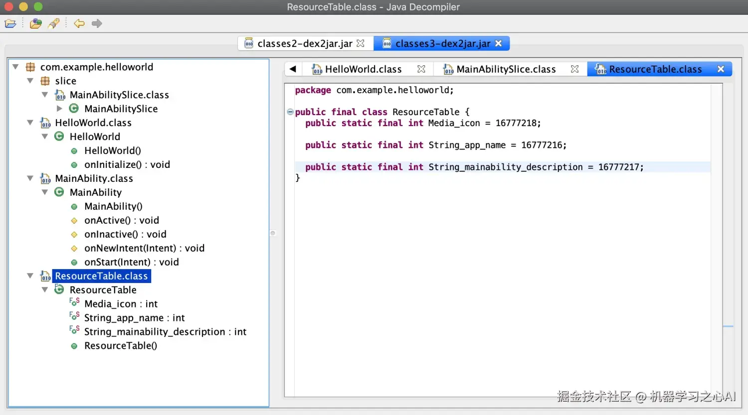 这里多了个ResourceTable文件,就是我们的资源id表。这里的dex文件包含的是我们开发的代码。