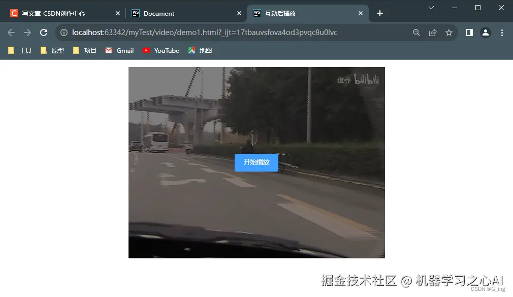 进入页面后发现不能自动播放,这时显示开始播放按钮,用户点击后开始播放。