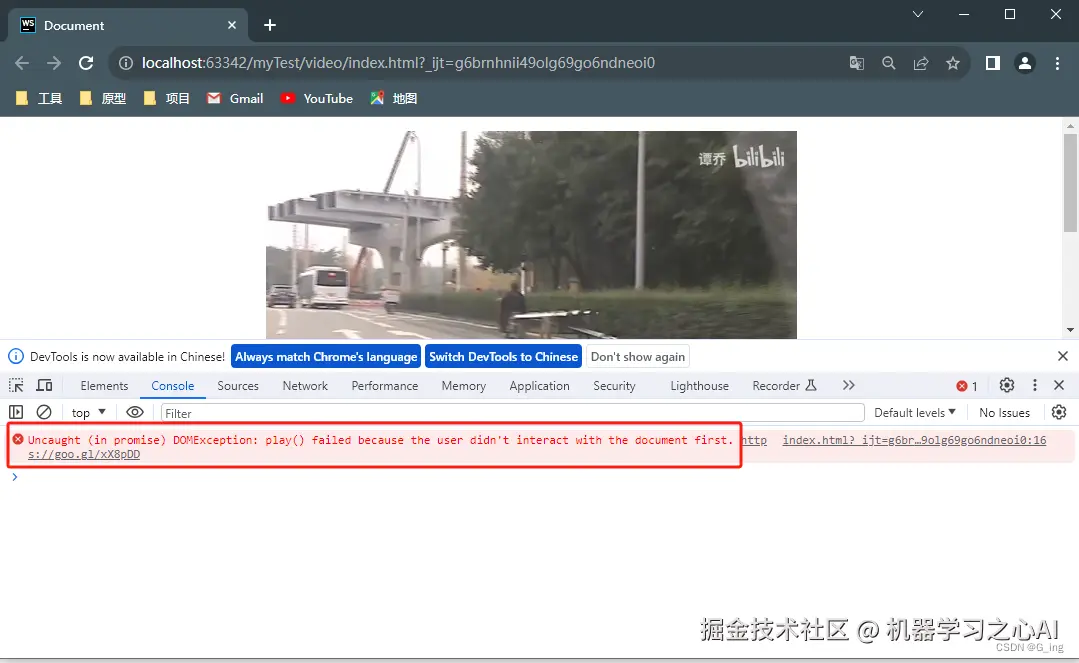 首先呢,我们直接在用户进入页面的时候play(),可以发现视频并没有播放,并且报错Uncaught (in promise) DOMException: play() failed because the user didn't interact with the document first