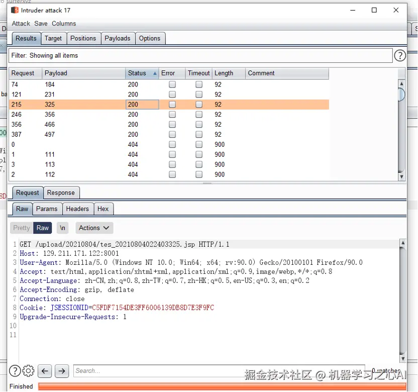 可以看到 3091.jpg 与 3184.jsp 这是百分比可以通过fuzz来确定我们上传的jsp文件的。