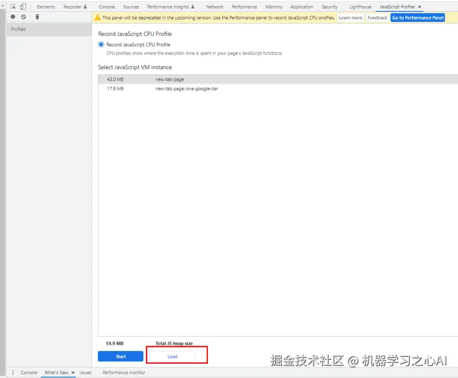 在 Chrome 浏览器上打开JavaScript Profiler工具并加载数据文件的操作步骤为:F12 > More tools > JavaScript Profiler > Load。