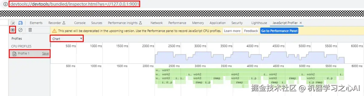 devtools://devtools/bundled/inspector.html?ws=//127.0.0.1:9006,端口号与上文一致,点击回车,进入JavaScript Profiler页面。 - 点击左上角录制按钮,按钮变为红色开始录制。