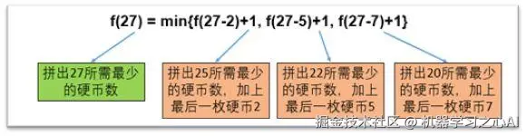 至此,通过找到原问题最后一步,并将其转化为子问题。为求面值总额27的最小的硬币组合数的状态就形成了,用以下函数表示: