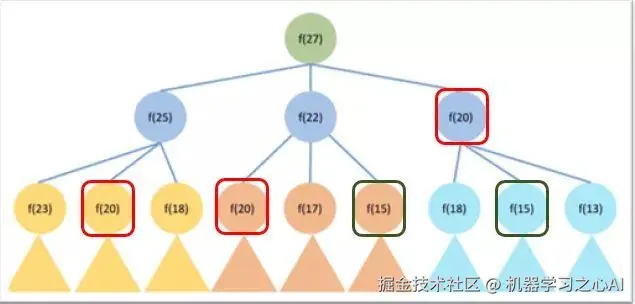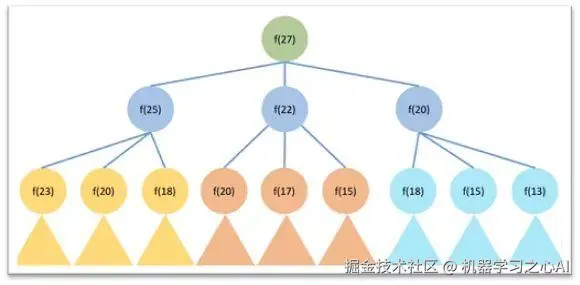 要算f(27),就要递归f(25)、f(22)、f(20),然后下边依次递归……(三角形表示)。