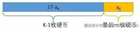 找出不影响最优策略的最后一个独立角色,这道问题中,那枚最后的硬币“aK”就是最后一步。把aK提取出来,硬币aK之前的所有硬币面值加总是27- aK因为总体求最硬币数量最小策略,所以拼出27- aK 的硬币数也一定最少(重要设定)。
