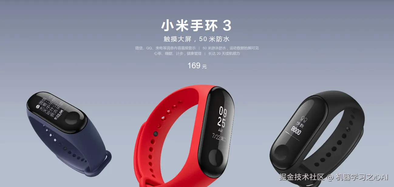 下面是小米手环3,可显示微信、来电等消息内容,振动闹钟,心率计算,步数统计,实时运动数据查询,睡眠质量监测等