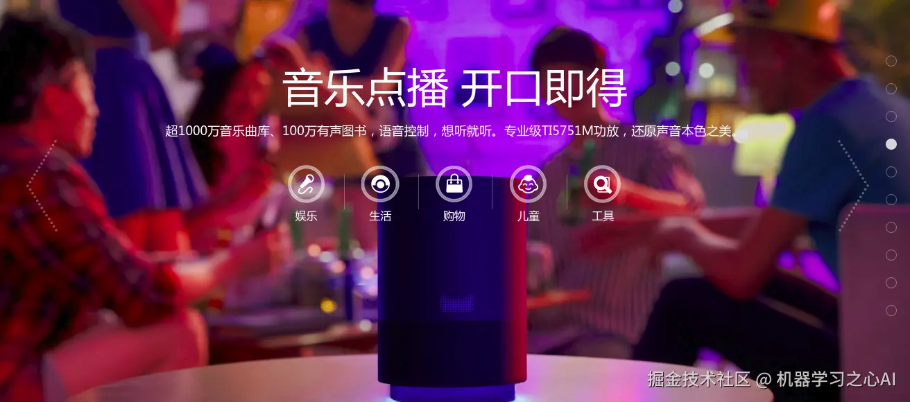 下面是天猫精灵智能音响,可进行语音识别、对话交互,应用与娱乐、生活、购物、智能家具控制等方面,属于新一代音箱