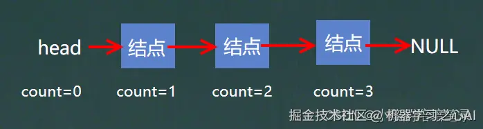 我们可以定义一个计数的变量count,初始化为0,然后循环遍历链表,每遍历到一个结点,count就加一,这样就能求出单链表的有效个数。