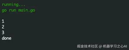 接着,在主函数中,我们使用for循环不断从通道中读取数据,直到通道被关闭。每次从通道中读取到一个整数后,我们将它输出。最后输出"done",表示所有的数据已经读取完毕。