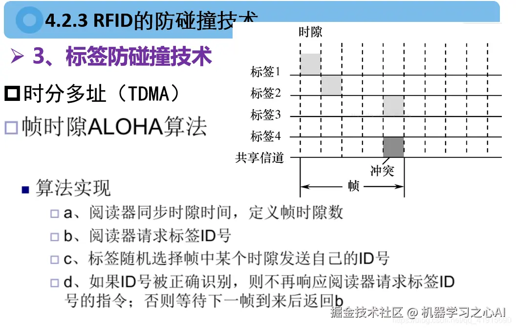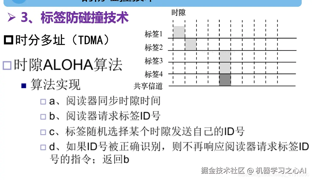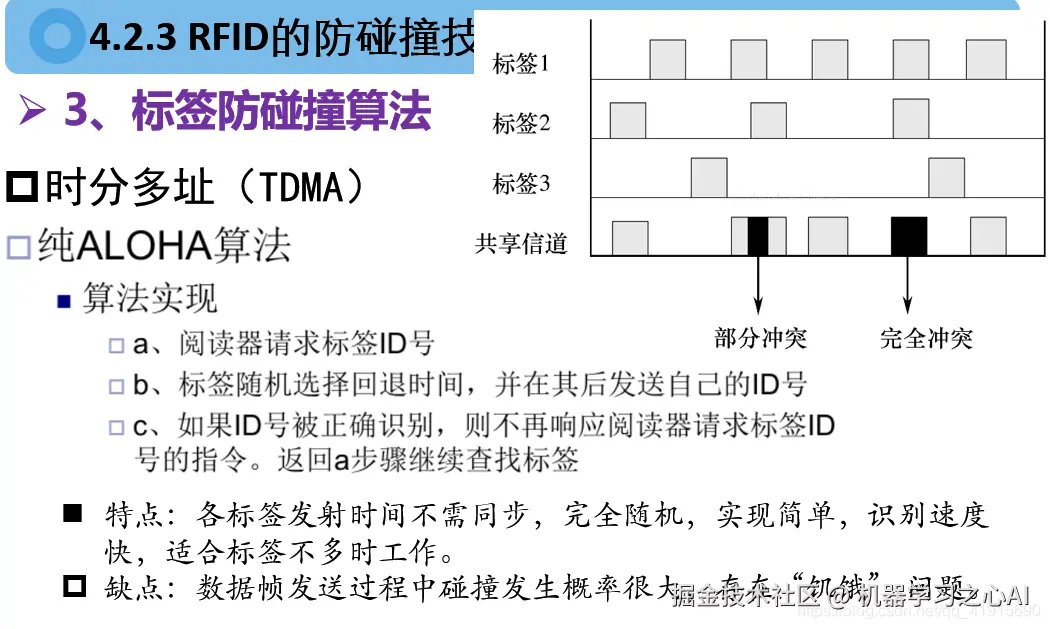 - 标签的防碰撞:四种。时分多址!!!!不需要掌握算法。