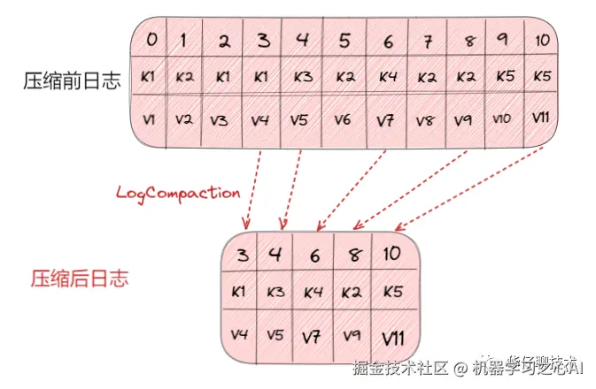 **日志压缩 Log Compaction 对于有相同key的不同value值,只保留最后一个版本。**如果应用只关心 key 对应的最新 value 值,则可以开启 Kafka 相应的日志清理功能,Kafka 会定期将相同 key 的消息进行合并,只保留最新的 value 值。