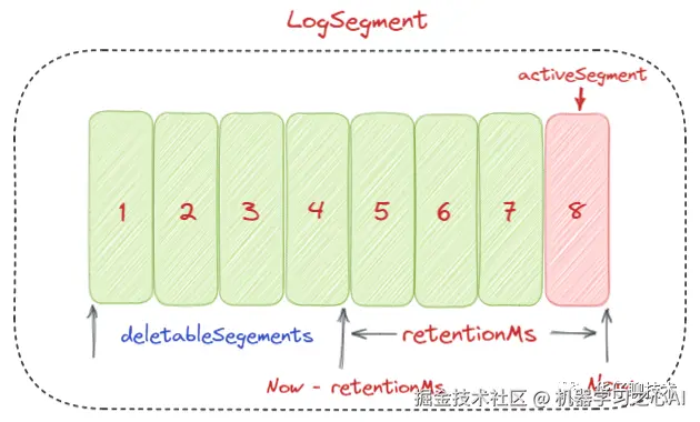 - 日志段4的下一个日志偏移量通过对比后,在 logStartOffset 的右侧,那么从日志段4开始的所有日志段都不会加入 deletableSegments。
