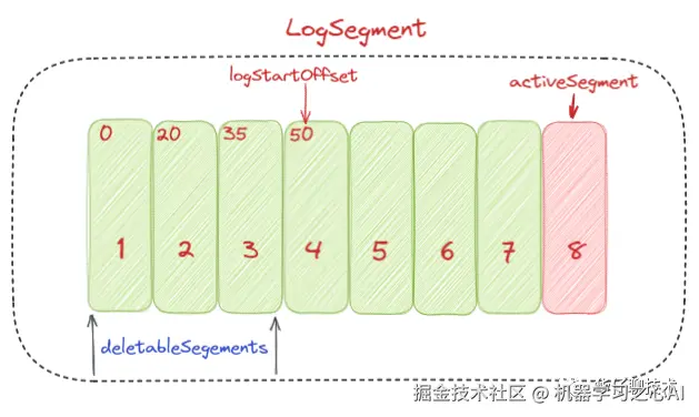 - 首先从头开始遍历每个日志段,日志段 1 的下一个日志分段的起始偏移量为20,小于 logStartOffset 的大小,将日志段1加入deletableSegments。