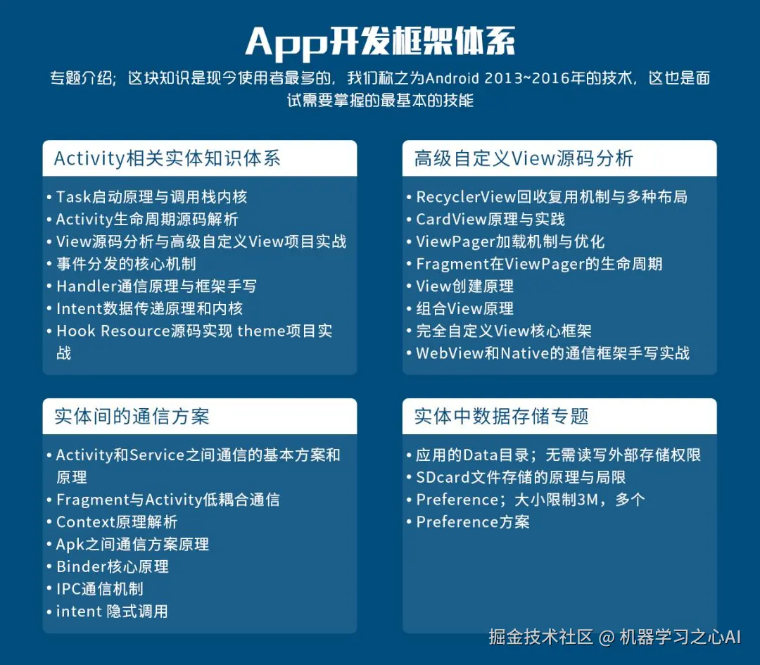 APP开发这块知识是现今使用者最多的,并且大多都是CV工程师,程序员界的2-8定律:80%的问题只需要使用20%的知识就可以解决,Android开发也不例外。因而,我们大部分人已经逐步变成了代码搬运工而自己却不知道。代码容易搬运,架构体系却难以复制,要成为架构师,你必须自己亲自去项目实战,读源码,研究原理。