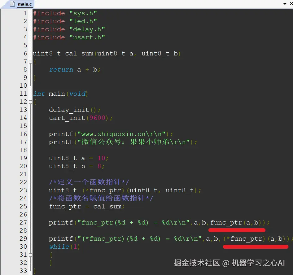 uint8_t (*func_ptr)(uint8_t, uint8_t) = NULL; /* 方法1 */ func_ptr= &cal_sum; /* 方法2 */ func_ptr= cal_sum;