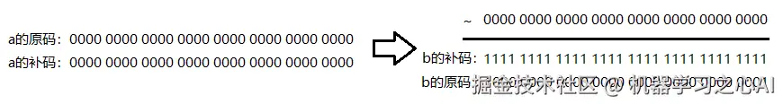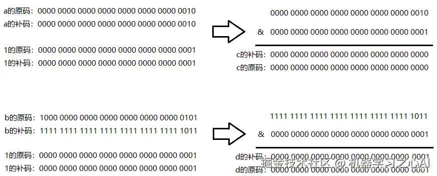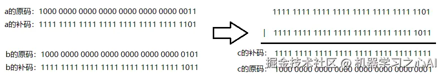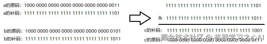 因为计算机中存的是二进制的补码,所以将 a 、b的补码按位与之后再转化成原码可得c(-7)