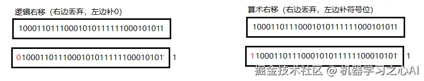 (右移运算符):当进行逻辑移位时,右边位丢弃,左边空缺位补0(右边丢弃,左边补0) ;