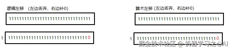 << (左移运算符):不论算术移位还是逻辑移位,均将左边的数舍弃,右边空缺位补0(左边丢弃,右边补0)