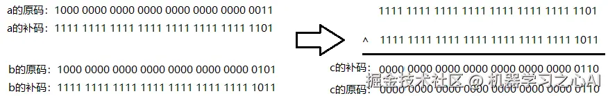 因为计算机中存的是二进制的补码,所以将 a 、b的补码按位或之后再转化成原码可得c(-1)