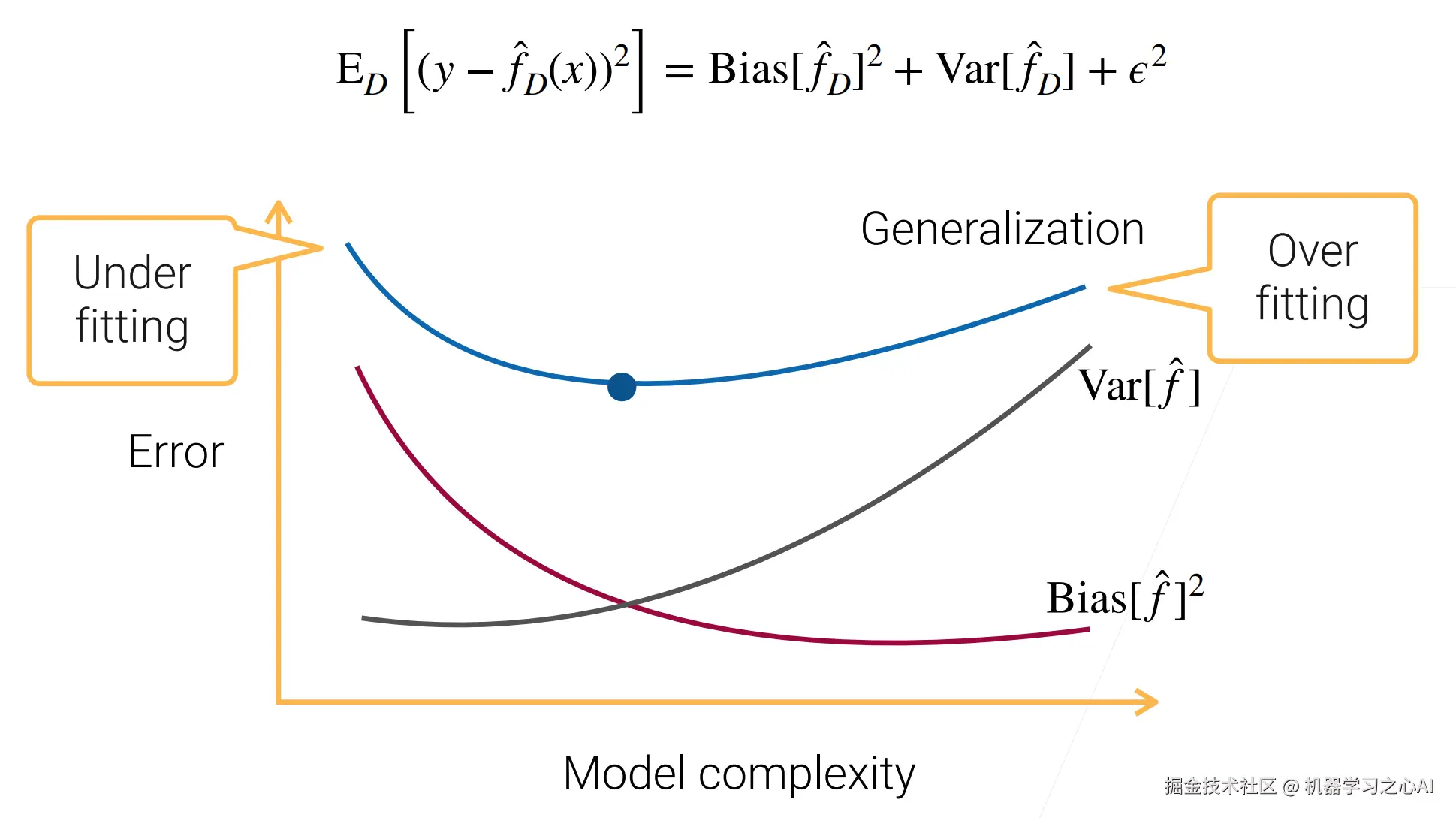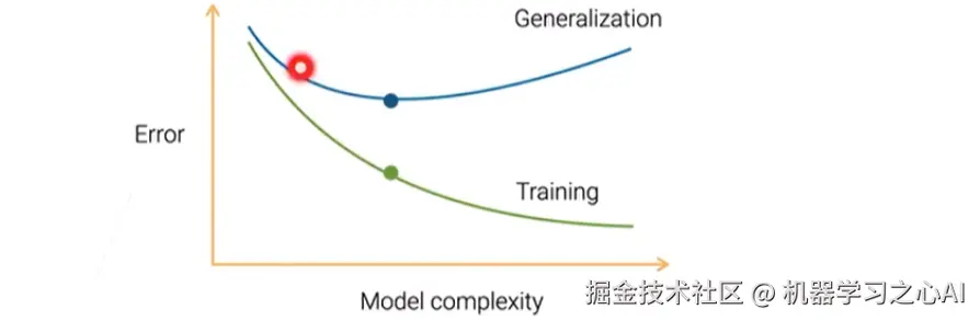 - 泛化误差 = 数据本身的噪音,但是数据本身没有变化,应该是个常数;但是加上了偏差和方差,最后就会导致最后的泛化误差曲线就会跟图中的蓝线一样