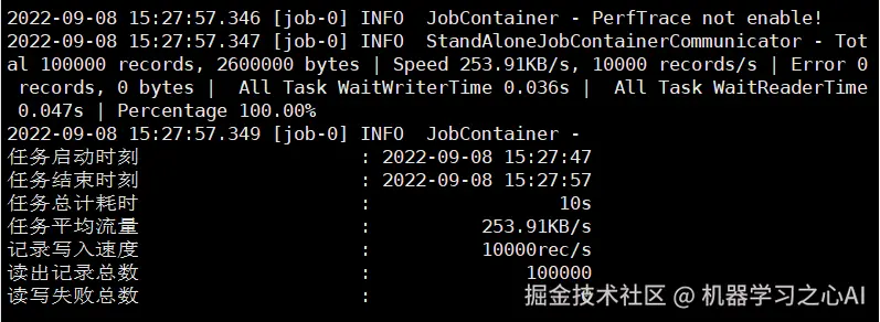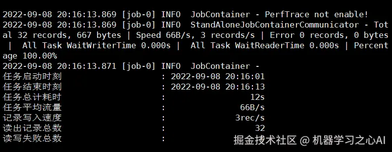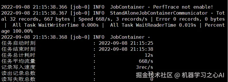 当出现上面的结果说明安装成功,这里我们用的是 DataX 自带的一个测试作业,它是一个 json 格式的文件,之后我们的 DataX 作业也是通过自己 编写 json 文件来实现。
