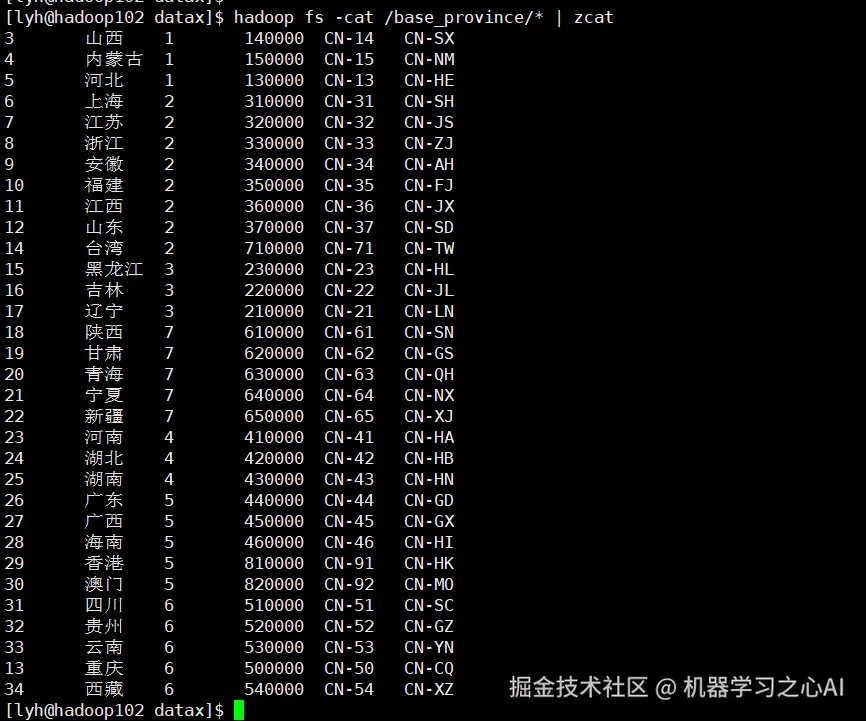 hadoop fs -cat /base_province/* | zcat