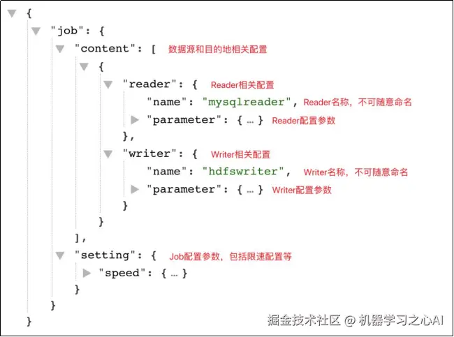 配置文件模板如下,json最外层是一个job,job包含setting和content两部分,其中setting用于对整个job进行配置,content用户配置数据源和目的地。