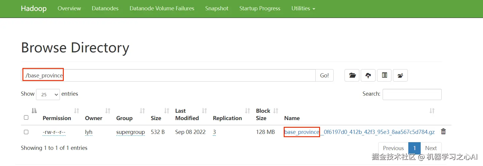 查看HDFS 中的文件内容(因为我们的文件是经过 gzip 压缩的,所以网页端查看不了):