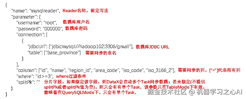 可以看到,TableMode 的 mysqlreader 中是通过在 connection 参数设置 table 参数的值来指定我们的表,而这里 QuerySQLMode 模式是通过 querySql 参数来指定 SQL ,从SQL中可以得到表名。此外,QuerySQLMode 模式没有 columns 和 where 参数,因为这些都可以在 SQL 中指定。