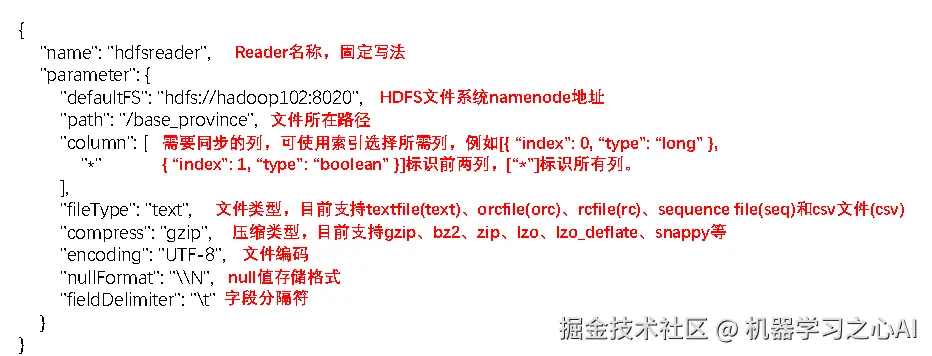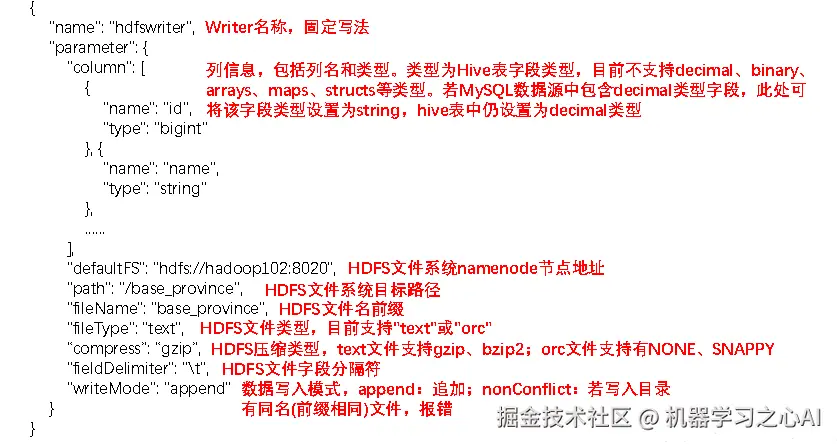 我们的 hdfswriter 中有一个 column 参数,但是我们知道 HDFS 是没有列的这个概念的。其实,这里代表的是我们Hive表中数据的字段类型,这个配置参数是给 Hive 看的。之后我们在使用 hdfsreader 的时候 依然要配置这个参数,这个参数的意义仍然是 hive 的数据字段。