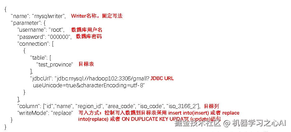 其中 writeMode 的三种不同取值代表三种不同的 SQL 语句,其中 replace 和 on duplicate key update 都要求我们的 MySQL 表是有主键的。我们经常使用的 insert 语句是不需要主键的,所以当有主键重复的时候会直接报错。而 replace 语句如果遇到表中已经存在该主键的数据会直接替换掉, on duplicate key update 语句的话如果遇到表中已经存在该主键的数据会更新不同值的字段。