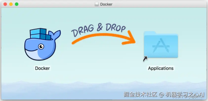 | 在载入 Docker app 后,点击 Next,可能会询问你的 macOS 登陆密码,你输入即可。之后会弹出一个 Docker 运行的提示窗口,状态栏上也有有个小鲸鱼的图标。 |