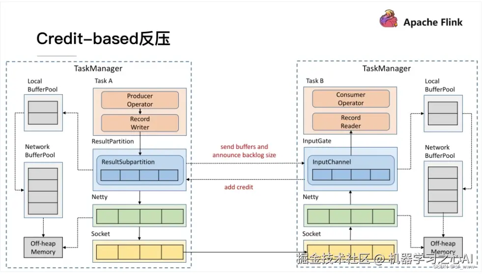 在 Flink 层面实现反压机制,通过 ResultPartition 和 InputGate 传输 feedback 。Credit-base 的 feedback 步骤:(1)每一次 ResultPartition 向 InputGate 发送数据的时候,都会发送一个 backlog size 告诉下游准备发送多少消息,下游就会去计算有多少的 Buffer 去接收消息。(backlog 的作用是为了让消费端感知到我们生产端的情况)(2)如果下游有充足的 Buffer ,就会返还给上游 Credit (表示剩余 buffer 数量),告知发送消息(图上两个虚线是还是采用 Netty 和 Socket 进行通信)。下面用图来解释: