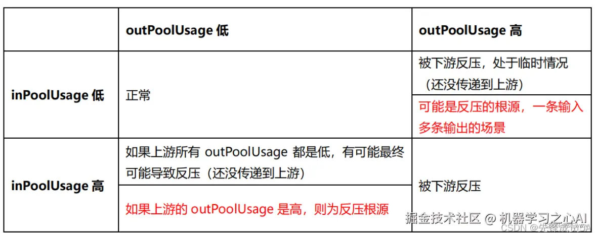 如果一个 Subtask 的发送端 Buffer 占用率很高,则表明它 被下游反压限速了;如果一个 Subtask 的接受端 Buffer 占用很高,则表明它将反压传导至上游。