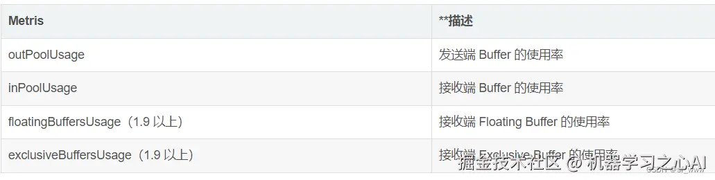监控反压时会用到的 Metrics 主要和 Channel 接受端的 Buffer 使用率有关,最为有用的是以下几个 Metrics: