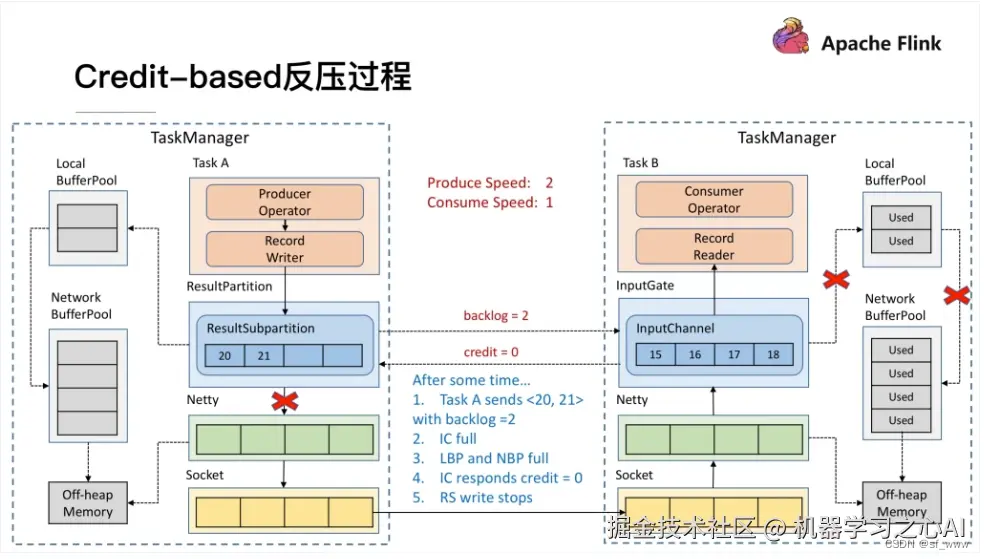 过了一段时间后由于上游的发送速率要大于下游的接受速率,下游的 TaskManager 的 Buffer 已经到达了申请上限,这时候下游就会向上游返回 Credit = 0,ResultSubPartition 接收到之后就不会向 Netty 去传输数据,上游 TaskManager 的 Buffer 也很快耗尽,达到反压的效果,这样在 ResultSubPartition 层就能感知到反压,不用通过 Socket 和 Netty 一层层地向上反馈,降低了反压生效的延迟。同时也不会将 Socket 去阻塞,解决了由于一个 Task 反压导致 TaskManager 和 TaskManager 之间的 Socket 阻塞的问题。