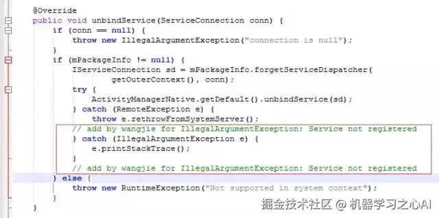 `public class ContextWrapper extends Context { ... ... @Override public void unbindService(ServiceConnection conn) { try { mBase.unbindService(conn); } catch (IllegalArgumentException e) { //com.google.android.gms.ui Service not registered Crash android.util.Log.e("wjwj","---ContextWrapper GMS Crash---"); e.printStackTrace(); } } ... ... }`