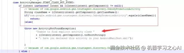 public class Instrumentation { ... ... /** @hide */ public static void checkStartActivityResult(int res, Object intent) { if (!ActivityManager.isStartResultFatalError(res)) { return; } switch (res) { case ActivityManager.START_INTENT_NOT_RESOLVED: case ActivityManager.START_CLASS_NOT_FOUND: if (intent instanceof Intent && ((Intent)intent).getComponent() != null) throw new ActivityNotFoundException( "Unable to find explicit activity class " + ((Intent)intent).getComponent().toShortString() + "; have you declared this activity in your AndroidManifest.xml?"); //GMS Setupwizard ActivityNotFoundException Crash if("com.android.wizard.NEXT".equals(((Intent)intent).getAction())){ android.util.Log.e("wjwj","Instrumentation GMS Setupwizard Crash "); return; } //GMS Setupwizard ActivityNotFoundException Crash throw new ActivityNotFoundException( "No Activity found to handle " + intent); case ActivityManager.START_PERMISSION_DENIED: throw new SecurityException("Not allowed to start activity " + intent); case ActivityManager.START_FORWARD_AND_REQUEST_CONFLICT: throw new AndroidRuntimeException( "FORWARD_RESULT_FLAG used while also requesting a result"); case ActivityManager.START_NOT_ACTIVITY: throw new IllegalArgumentException( "PendingIntent is not an activity"); ... ... } } ... ... }