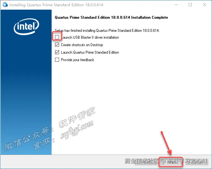 9.取消勾选【Launch USB Blaster …】,点击【Finish】。