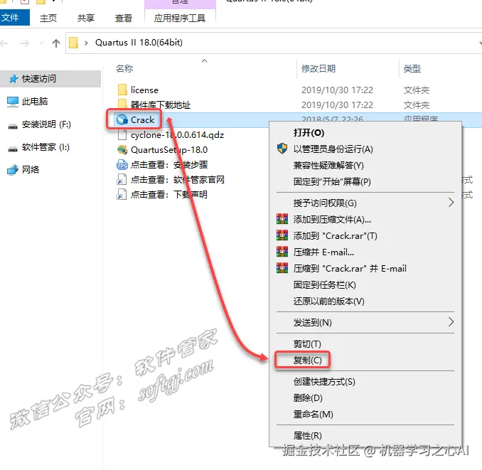 18.打开安装包解压后的【Quartus II 18.0(64bit)】,鼠标右击【Crack】选择【复制】。