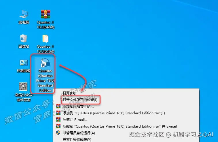 19.鼠标右击桌面【Quartus (Quartus Prime 18.0) Standard Edition】选择【打开文件所在位置】。