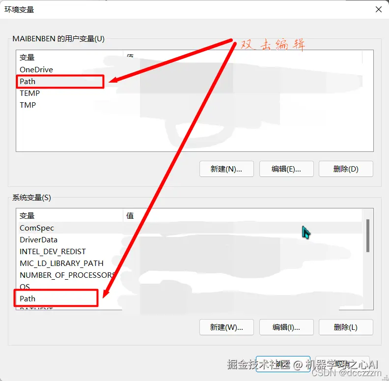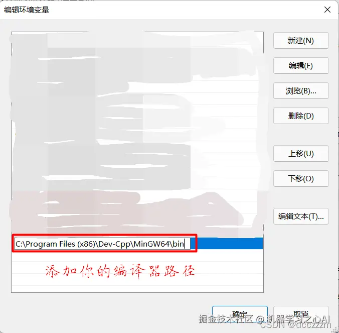 打开环境变量后,在上下两组环境量中都选择“path”环境变量,在其中添加你的编译器路径。